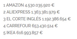 Es resaltable que entre el segundo y el tercero realmente tenemos muy poca diferencia en comparación con el cuarto clasificado, el francés Carrefour. Por último en quinto lugar tenemos a Ikea, el gigante de los muebles.