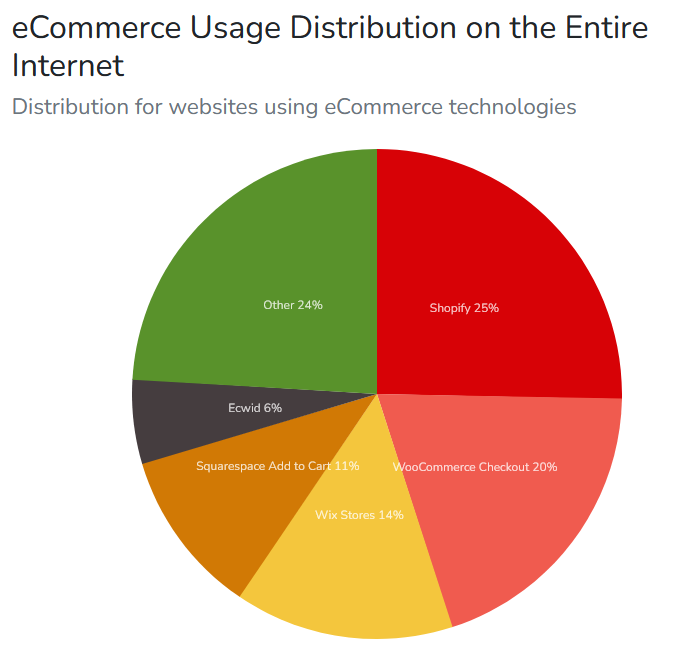 El siguiente gráfico nos ofrece el % de uso de diferentes plataformas en todos los sitios en el Internet global. Shopify es el primero y Woocomerce el segundo.