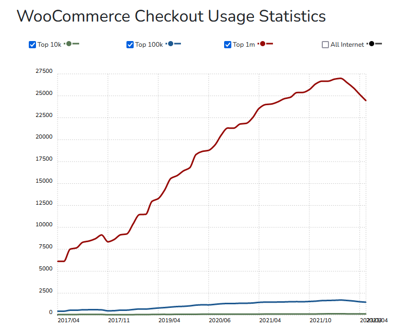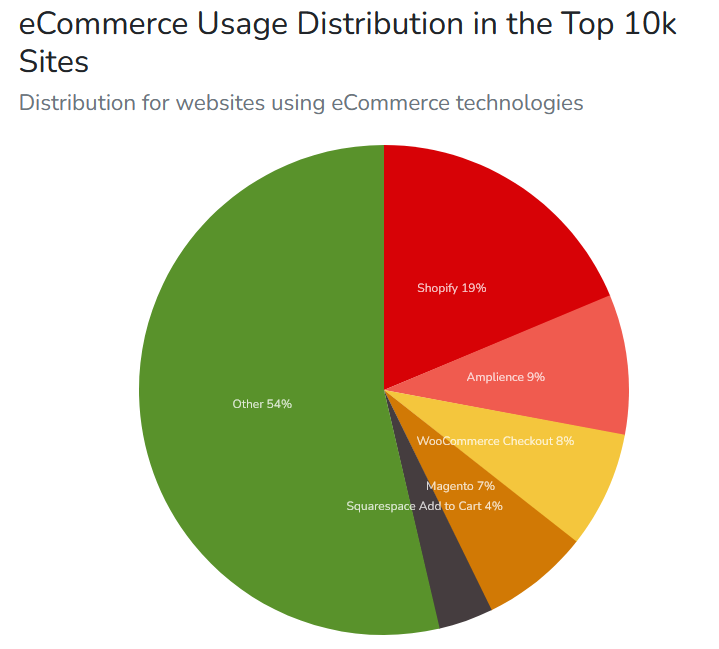 Como comparación si filtramos a los primeros 10000 sitios rankeados se observa que Woocommerce baja a la tercera posición. El gráfico quedaría: