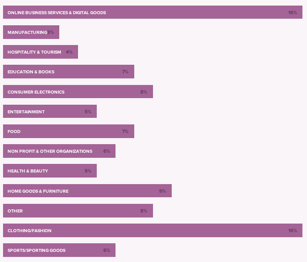 Si nos fijamos en el gráfico inferior, realizado en 5000 tiendas, observamos que los servicios online, artículos digitales y artículos de moda son los principales sectores que usan esta herramienta aunque se observa una gran diversificación de tipos de negocio.
